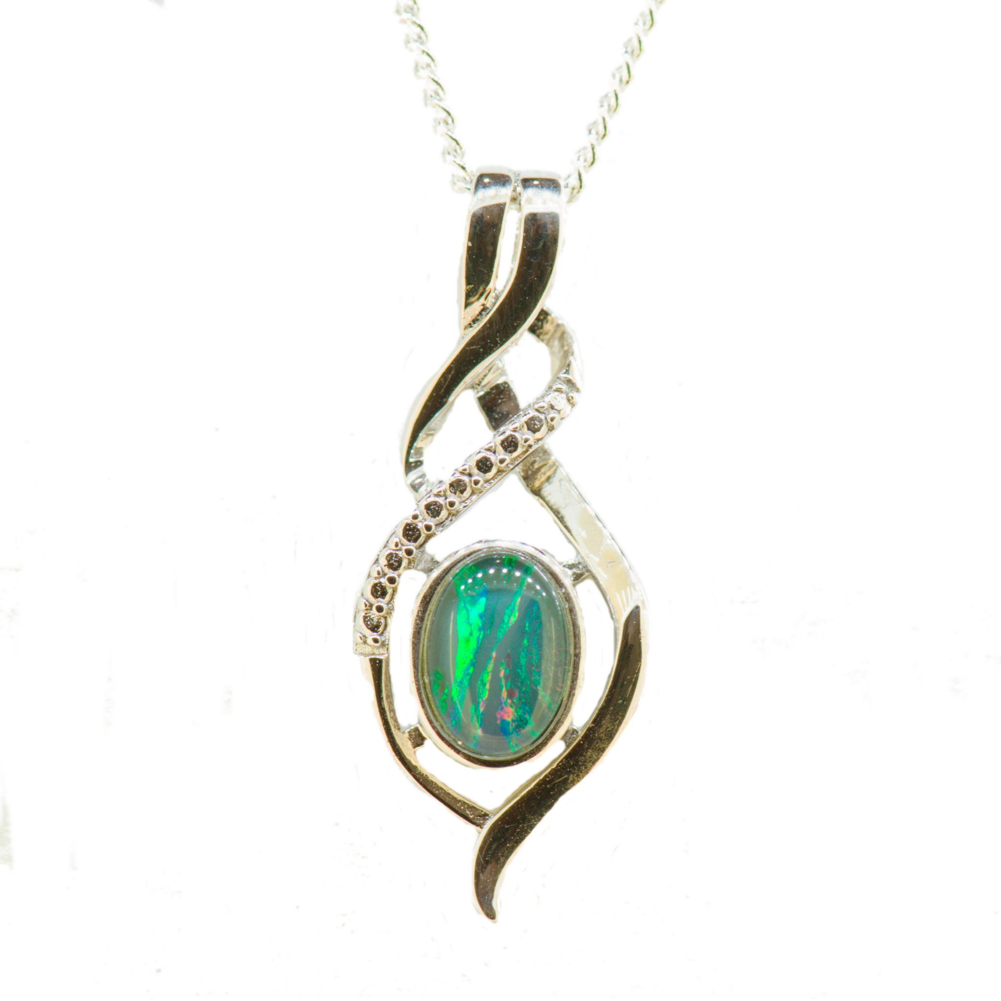 This pendant is made with an Australian Triplet Opal, Cubic Zirconia’s, and set in Sterling Silver. This pendant comes with a complimentary silver-plated chain