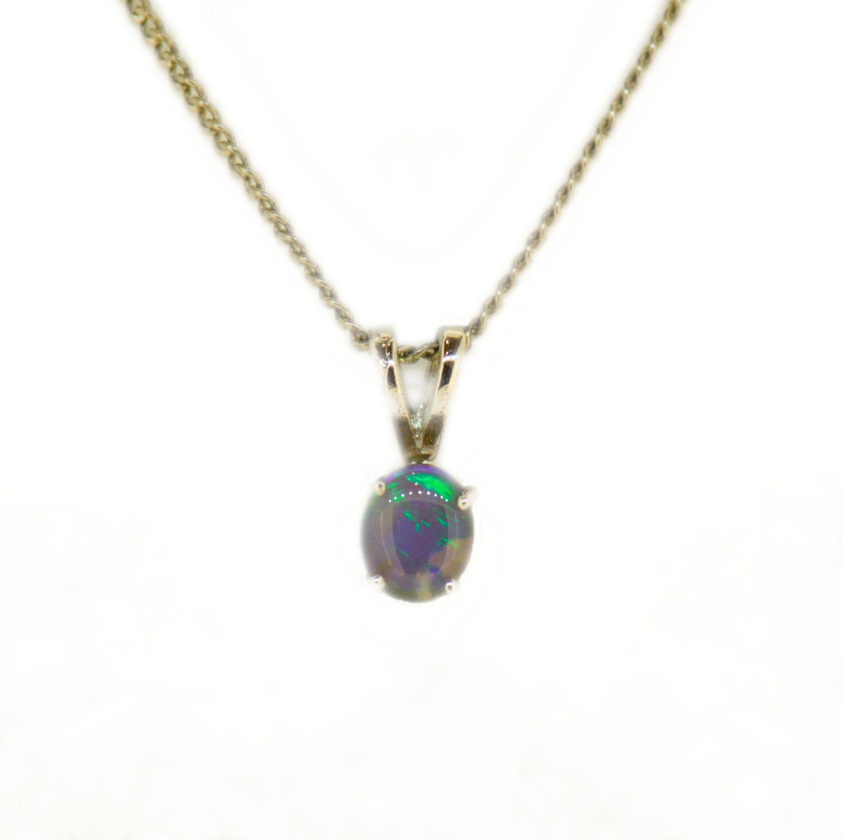 This pendant is made with Solid Lightning Ridge Black Opal and set in 14ct White Gold. This pendant comes with a complimentary silver-plated chain