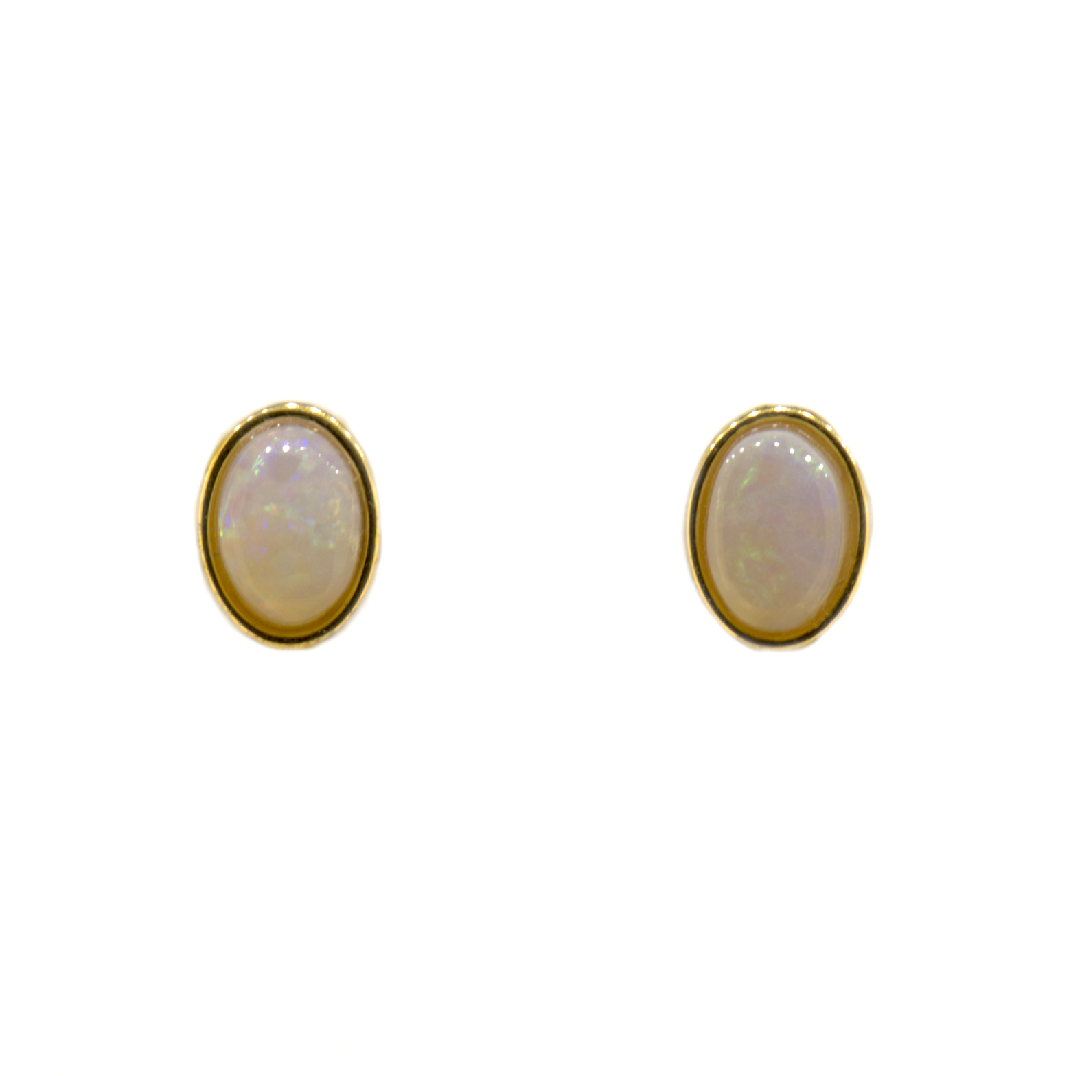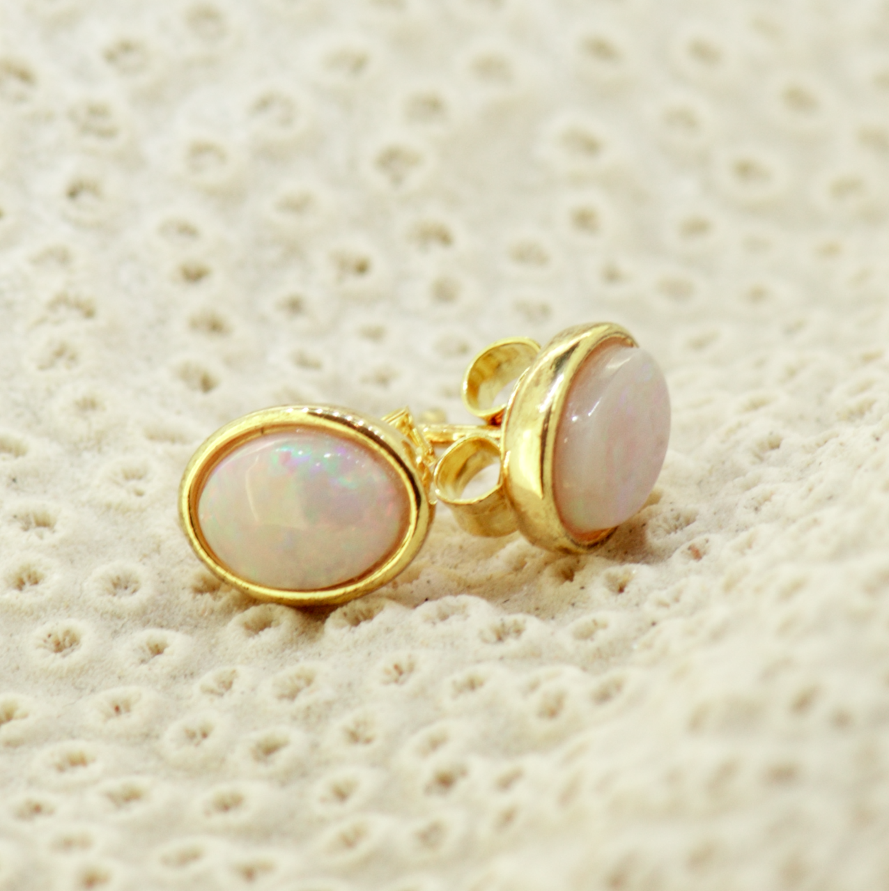 These earrings are made with Solid Australian White Opal and set in Gold-plated Sterling Silver. These earrings are studs and come with fitted butterfly backings.