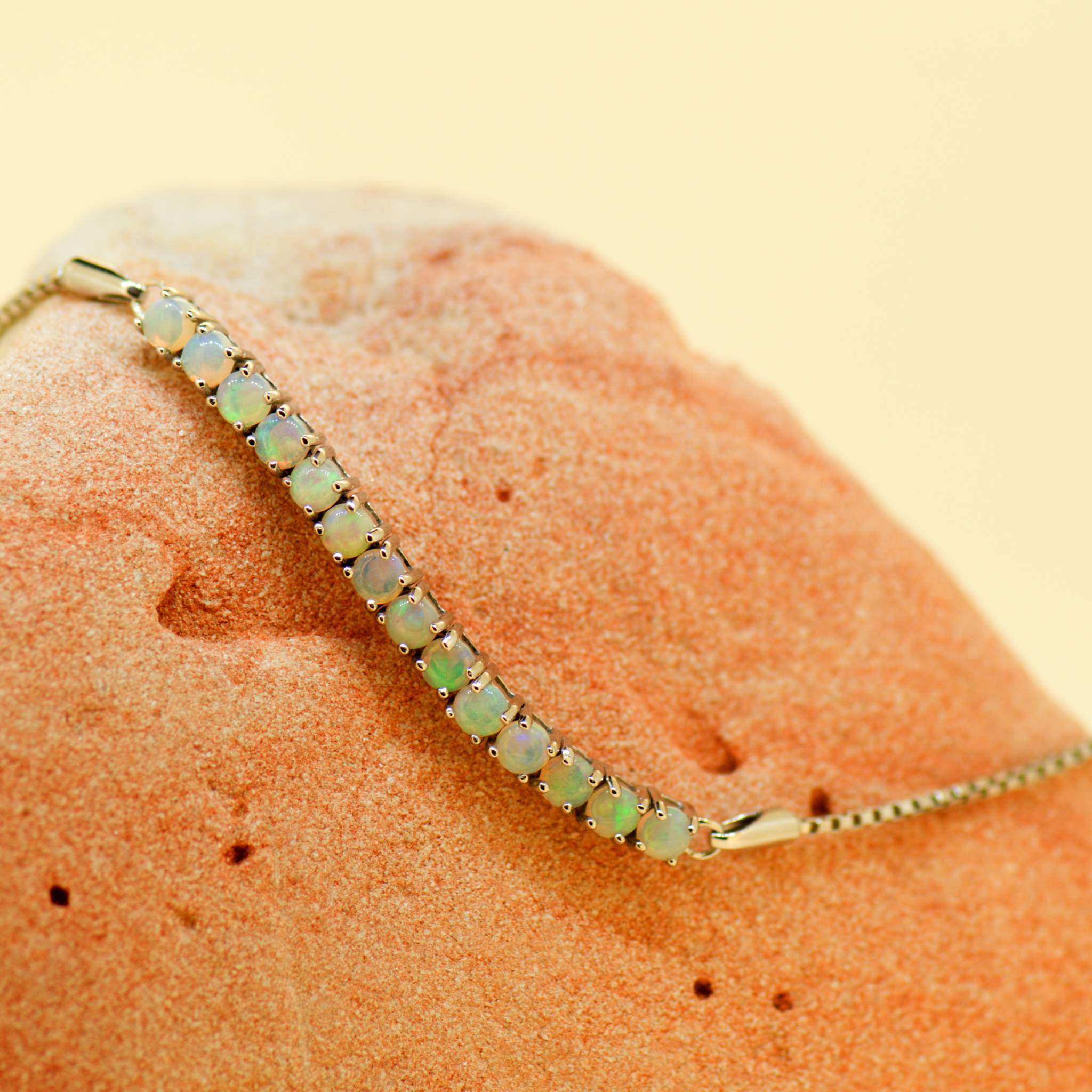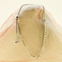 This bracelet is made with solid Australian crystal opals and set in sterling silver. The size can be adjusted by sliding the silver ball.