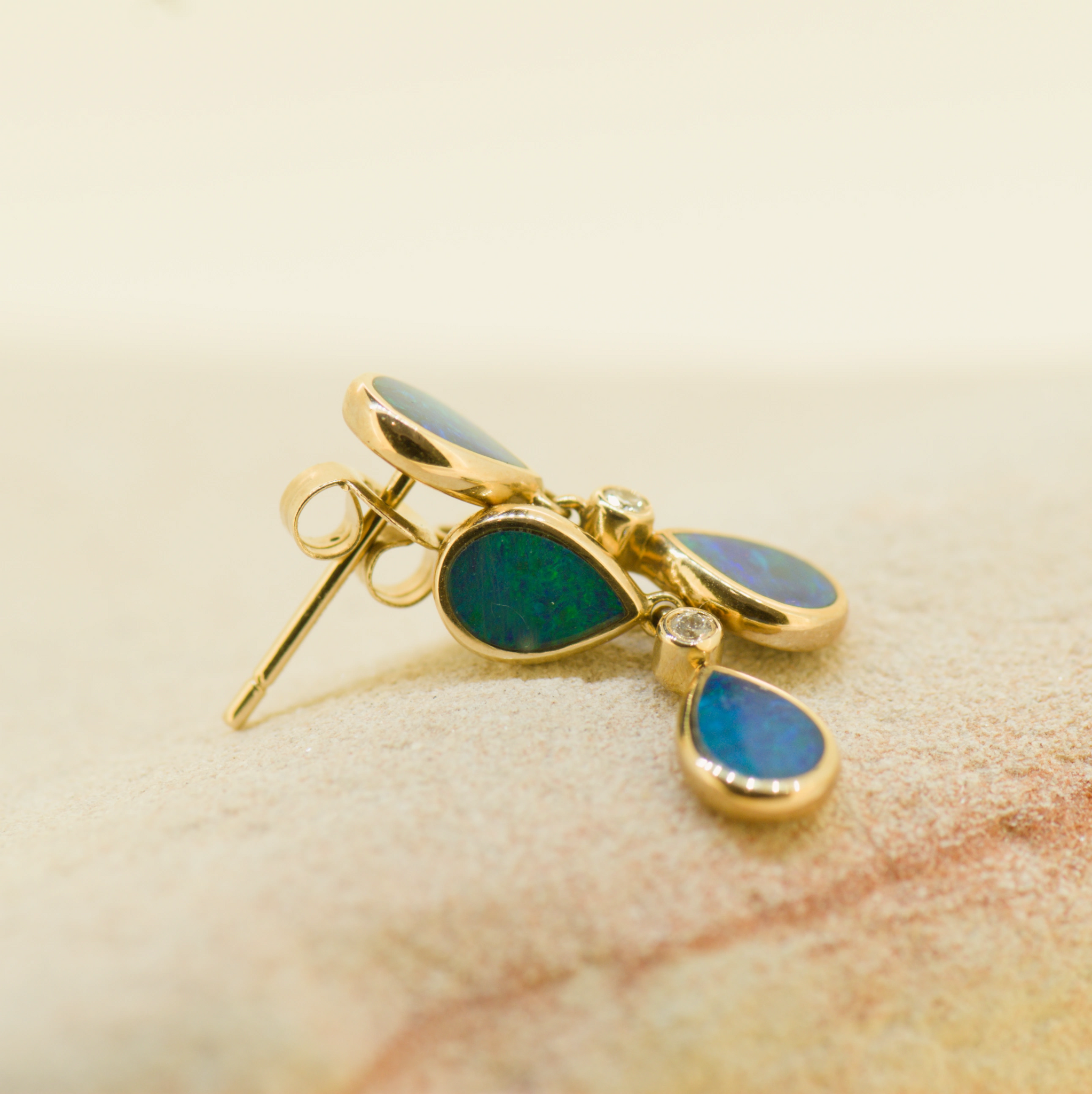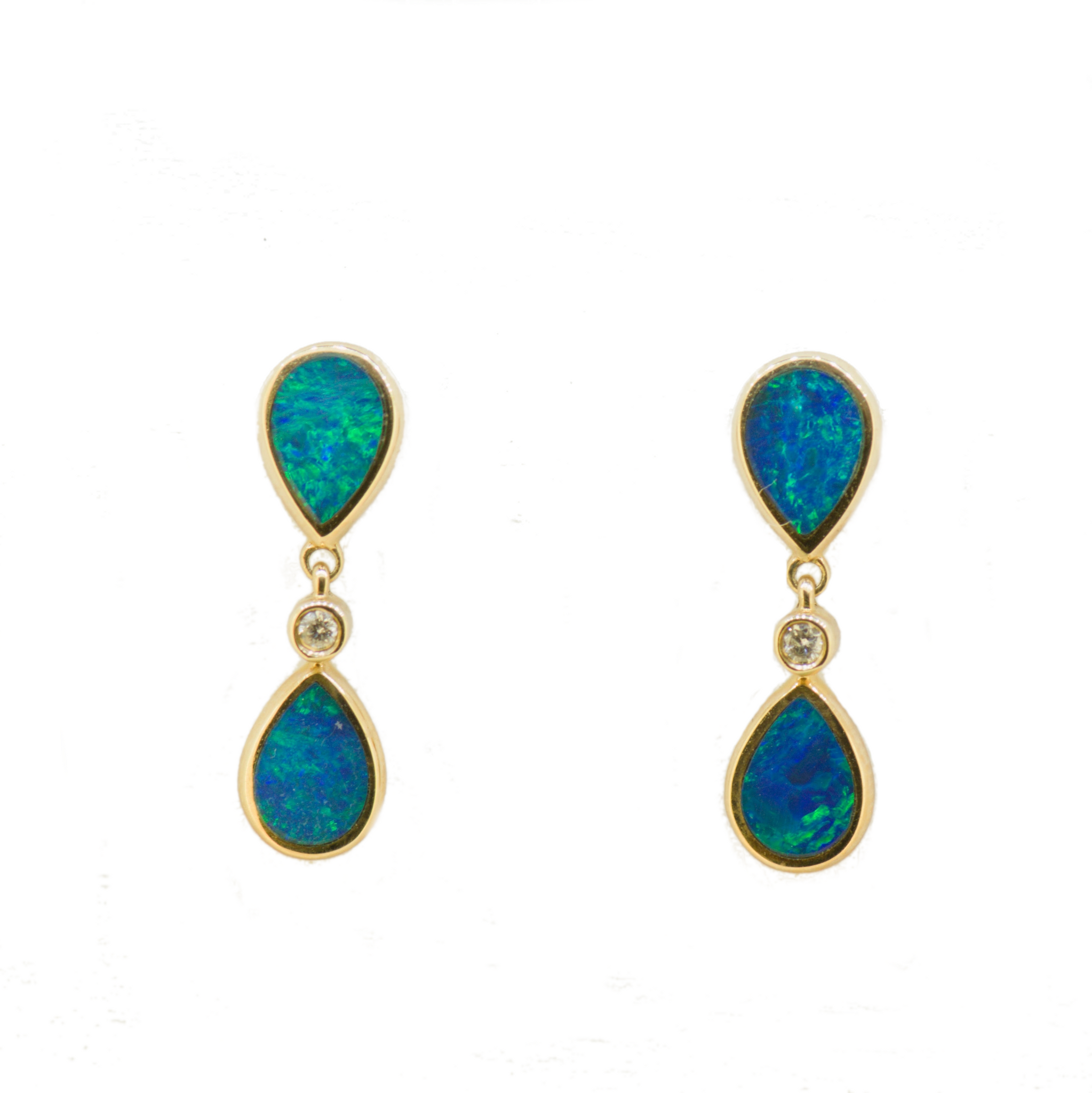 These earrings are made with Australian Doublet Opals, diamonds, and set in 14ct Yellow Gold. These earrings are studs and come with fitted butterfly backings.