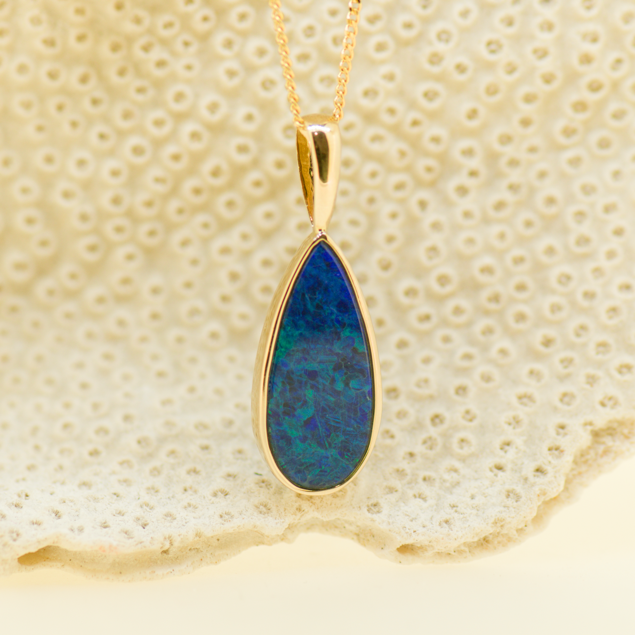 This pendant is made with an Australian Doublet opal and set in 14ct Yellow Gold. This pendant comes with a complimentary gold-plated chain.